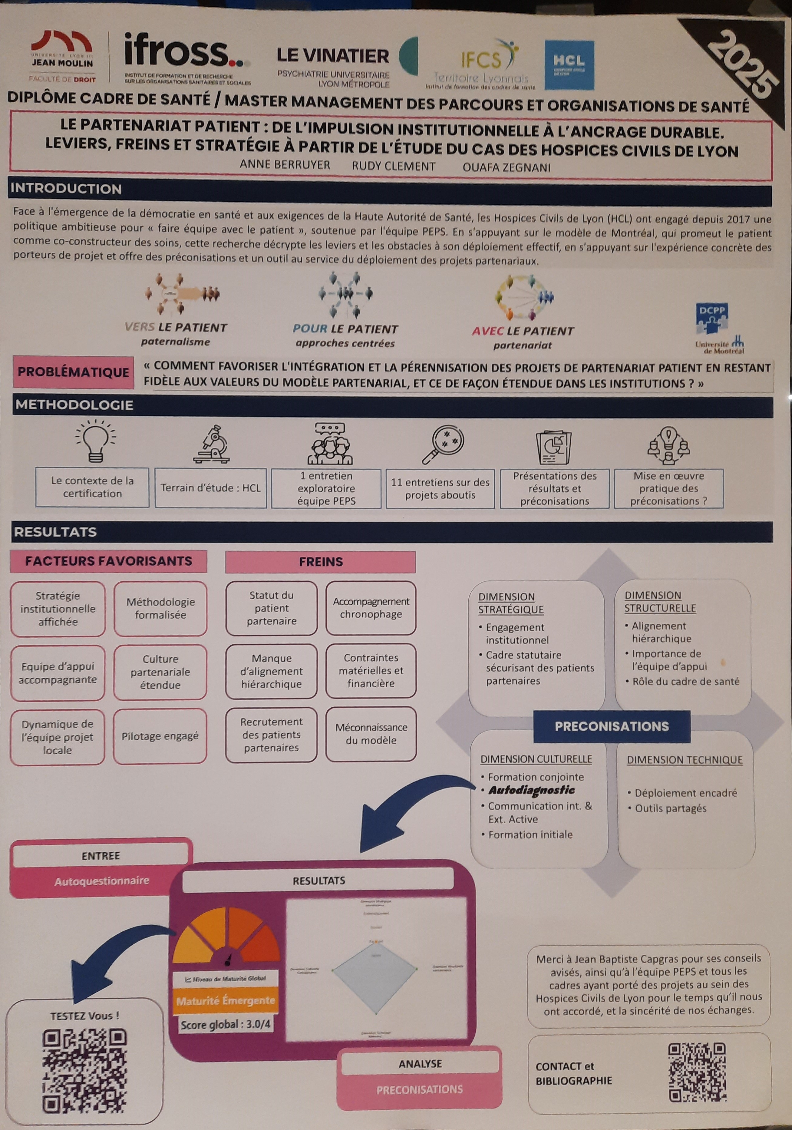 MENUT Aude, BALLAGUY-FONTAINE Virginie Portes du Sud Vénissieux, MARCOUX Valentine CH de Dreux, BONINI Vincent - Cadres de Santé« Le partenariat patient : de l’impulsion institutionnelle à l’ancrage durable. Leviers, freins et stratégies à partir de l’étude de cas des Hospices Civils de Lyon »